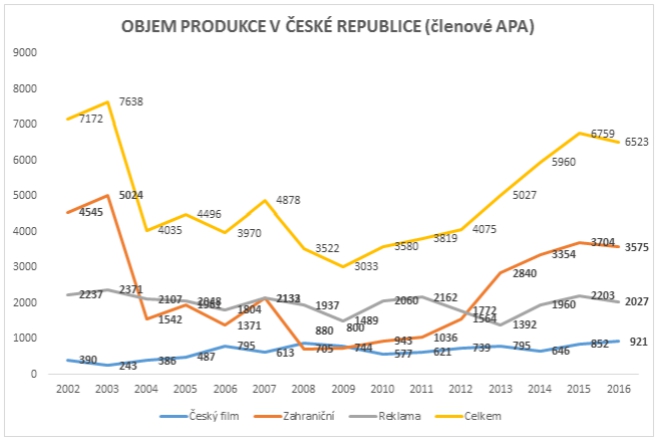 Klesly rovněž reklamní zakázky, z 2,203 miliardy na 2,027 miliardy korun. Podle zástupců APA za poklesem reklamy stojí novela silničního zákona, jež prodloužila lhůty k získání povolení na zábory lokací. Vstoupila v platnost k 1. ledna 2016, reklamní produkce s ní spojují ztrátu přibližně pětiny zakázek. Jediným rostoucím segmentem byl český film a TV díla, který vyskočil z 852 milionů na 921 milionů korun.