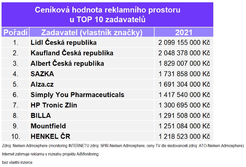 Tato čísla je třeba brát s rezervou, protože jsou ve srovnání s realitou hodně "ustřelená", na druhou stranu z monitoringu lze vydedukovat trendy. Navíc hodnota za internet vychází pro rok 2021 expertně upravena na základě odhadu SPIR pro rok 2021. Všechny mediatypy sledované v rámci monitoringu zaznamenaly v minulém roce nárůst ceníkové hodnoty reklamního prostoru (viz následující žebříček).