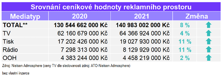 Celková ceníková hodnota reklamního prostoru v českých médiích loni dle monitoringu Ad Intel společnosti Nielsen Admosphere dosáhla téměř 141 miliard korun (hrubé reklamní investice), což představuje nárůst o 8 procent oproti roku 2020, kdy činila 130,5 miliardy korun.
