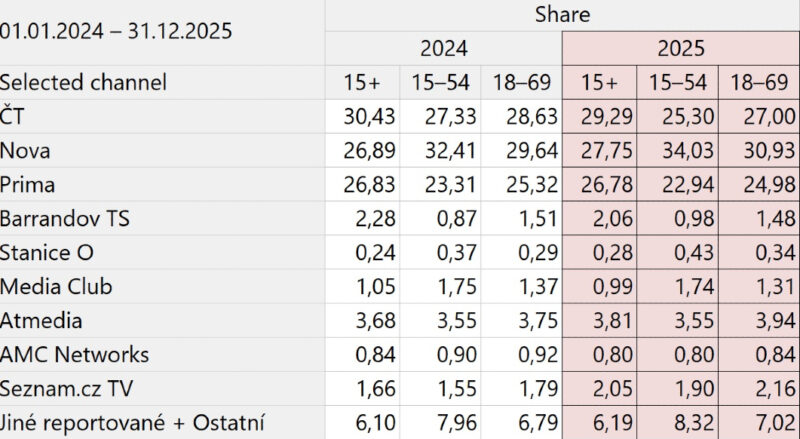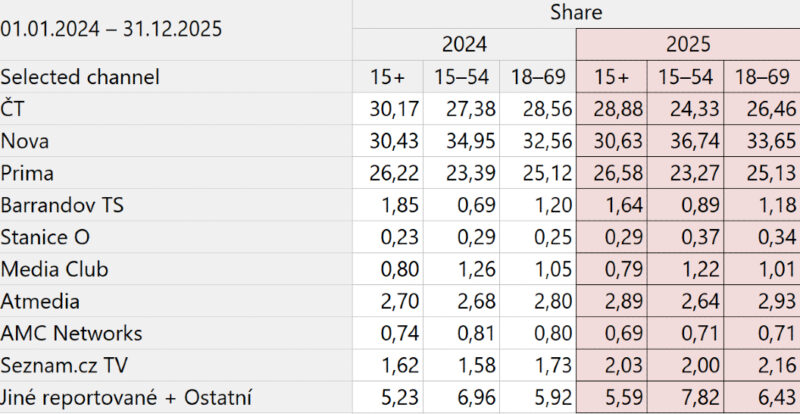 Na českém televizním trhu v roce 2025 vládly zejména Česká televize a Nova, a to vždy v rozdílných cílových skupinách. Obě stanice si tak udržely své pozice z předchozího roku. Pokračoval pokles TV Barrandov, mírně klesalo i Óčko. Vyplývá to za čerstvých údajů Asociace televizních organizací, které doplňují náš článek z minulého týdne (viz zde).